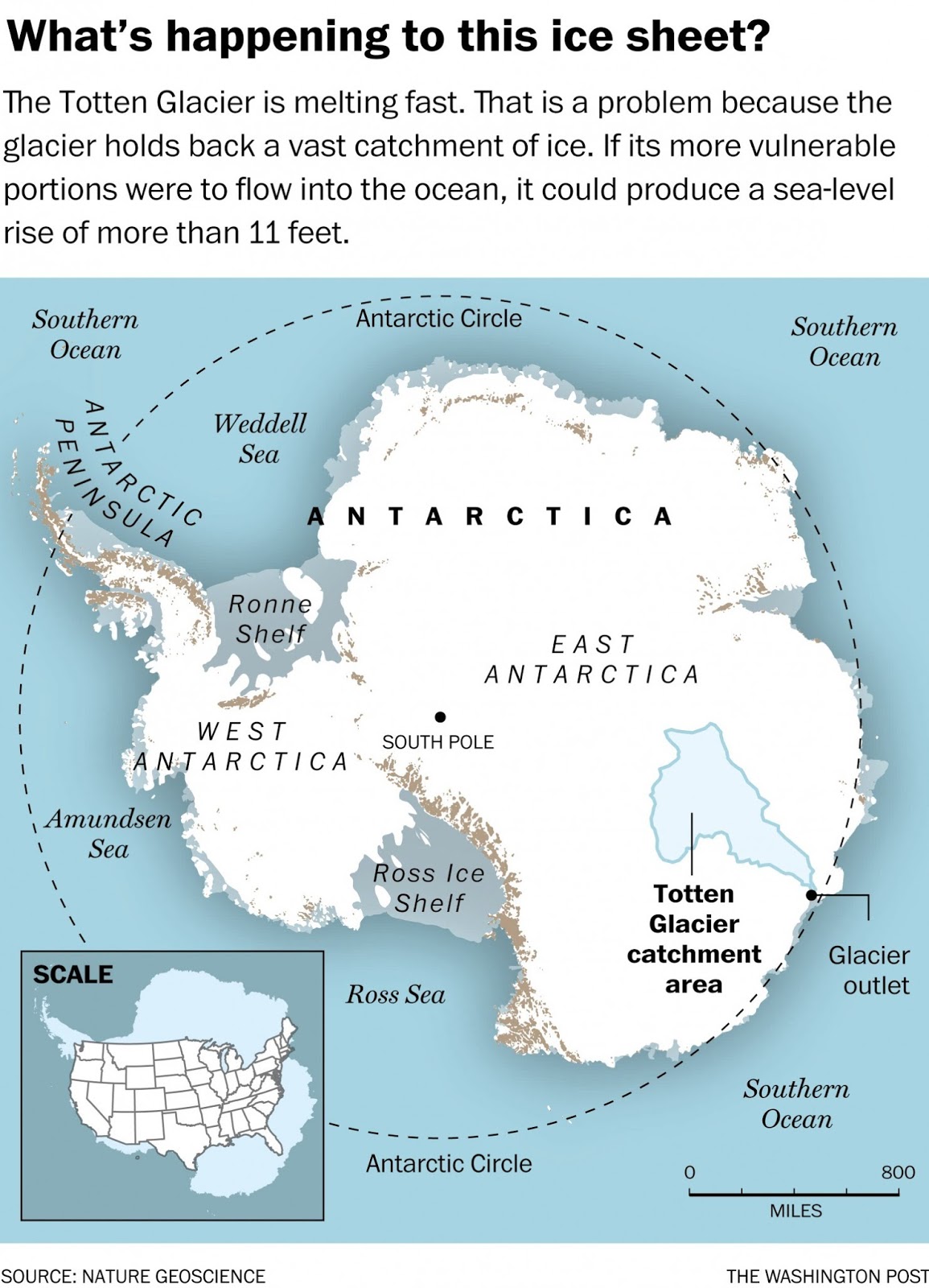 - (9) Les dimensions del Totten Glacier: 120 quilòmetres de llarg i més de 30 km d'ample, un dels sistemes glaceres més grans i menys estudiats del món, amb una quantitat de gel que podria elevar de 6 metres el nivell del mar a tot el planeta.