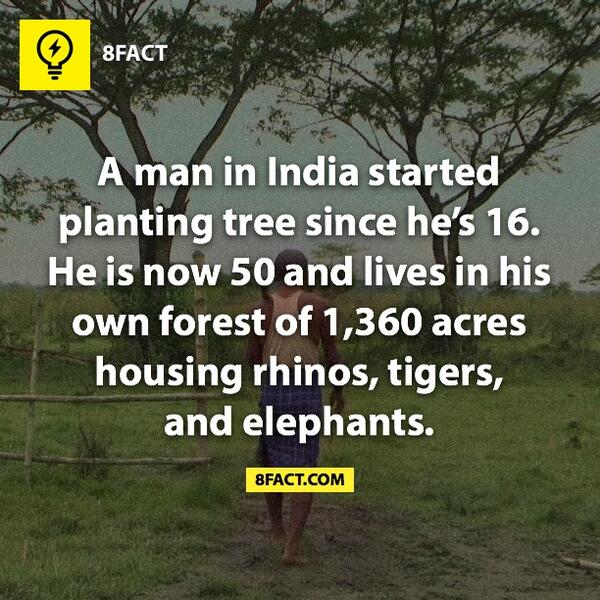 Més enllà dels grans discursos sobre el canvi climàtic estan els fets. Entre aquests, que la millor eina per capturar el CO2 és tornar a fixar-lo en la vegetació. I més enllà de totes les especulacions costoses en maquinària o processos industrials per la fixació del CO2, hi ha el treball infatigable d'en Jadav Payeng que, des de 1979, s'ha dedicat a plantar un bosc de més de 500 Ha. i ha crear així una reserva forestal que està acollint animals en perill d'extinció en uns terrenys que l'acció de l'home havien transformat en un àrid desert.